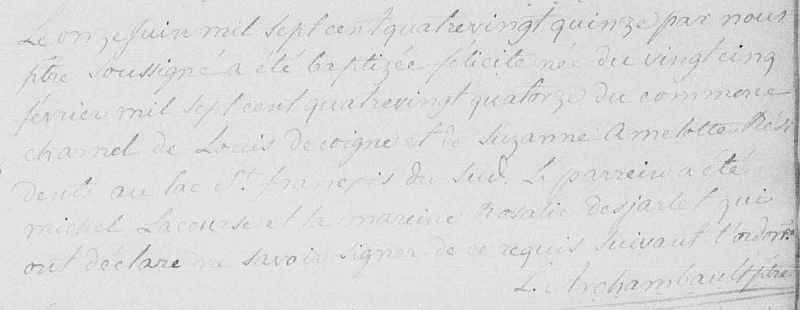 Le douze mars mil sept cent quatre vingt dix neuf par nous ptre soussigné a été baptizée marguerite née du cinq février de la susditte année du légitime mariage de James Knight et de Sazanne Amelot ses père et mere cultivateur résident en la mission du Sud du Lac St françois. Le parrein a été Joseph provot et la mareine marguerite Gendron qui ont déclaré ne savoir signer ainsi que le pere, de ce requis suivant l'ordonnance.