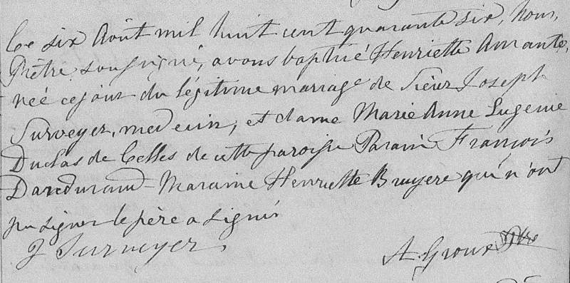 Ce six Août mil huit cent quarante six, nous Prêtre soussigné avons baptisé Henriette Amante, née ce jour du légitime mariage de Sieur Joseph Surveyer, medecin, et dame Marie Anne Eugenie Duclos De Celles de cette paroisse. Parrain François Dandurand - Maraine Henriette Bruyere qui n'ont su signer le pere a signé.