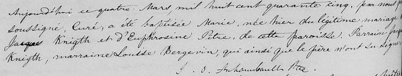 - Baptême de Marie Knight à Saint Timothée de Beauharnois (4 mars 1845)
