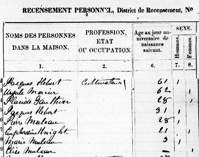 - Recensement de Pierre Muleau et de Euphrosine Knight à Saint Timothée de Beauharnois (1851)