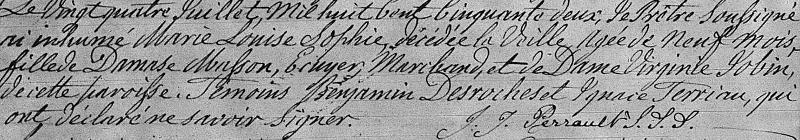 15. Marie Louise Sophie Masson, naquit le 26 octobre 1851 et fut baptisée le lendemain à Notre Dame de Montréal; ses parrain et marraine étaient Thomas Edmond D’Odet D’Orsonnens et Marie Louise Adéline Dorval. Elle mourut le 23 juillet 1852 à l'âge de 9 mois et fut inhumée le lendemain. (Cet acte est trouvé plus bas.) Elle est donc décédée en bas âge;