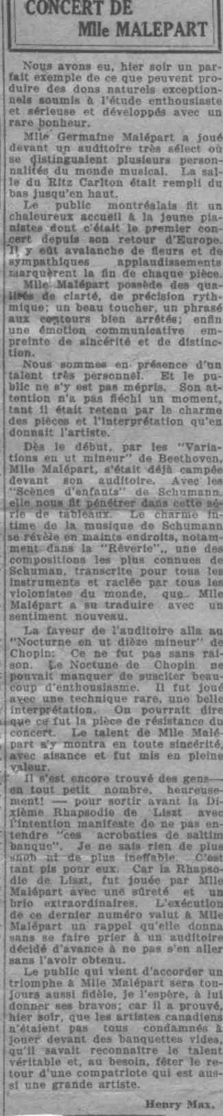 Mlle Malépart a fait ses premières études musicales avec M. Arthur Letondal qui a su