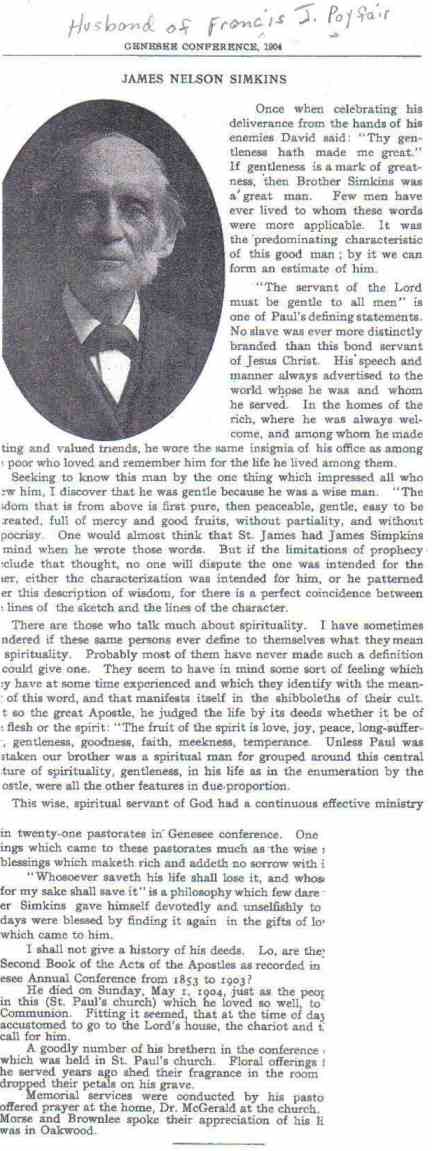 On 31 July 1876, Frances Ellen married at the Clinton Street Methodist E Church in Lockport, Niagara County, New York State, James Nelson Simkins. The The Reverend S. Hunt officiated, assisted by the Reverend C. S. Smith.